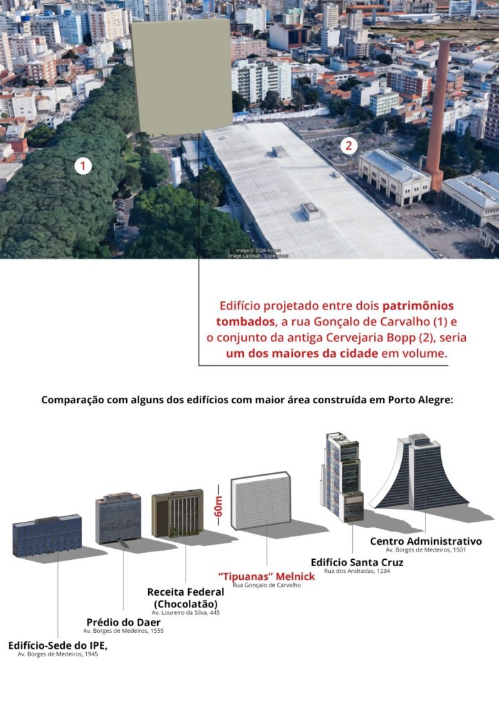 A construtora Melnick anunciou um projeto imobiliário milionário, sorrateiramente já aprovado na prefeitura de Porto Alegre, que prevê a construção de uma torre residencial de 20 andares mais 4 pavimentos no “subsolo”, totalizando 24 andares, a ser implantado na Rua Gonçalo de Carvalho, na área de estacionamento do Shopping Total, parceiro do empreendimento. Com 60 metros de altura e 163 apartamentos, será o prédio mais alto da rua, cujo limite de construção, conforme o atual Plano Diretor do município, é de 12,3 metros. O projeto prevê ainda a ampliação da área do shopping com uma cervejaria de 300 m².